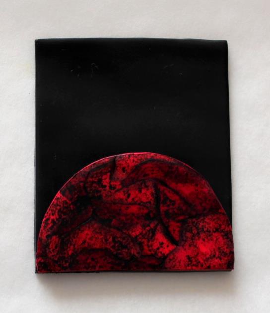 Préparez un rectangle de Cernit noire avec un rouleau ou la machine à pâte (dans le langage des fimoteuses, on ne dit pas “préparer”, mais “conditionner”). Cette pièce noire sera la base du collier sur laquelle vous allez venir positionner les différents éléments. Puis découpez des petits morceaux de Cernit rouge :