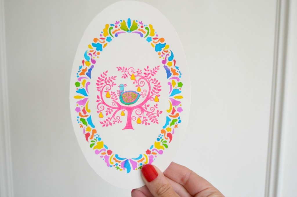 Lorsque la peinture est sèche : décollez les lettres. Le joli papier que vous avez choisi apparaît alors pour donner vie à votre texte. Pour ajouter une touche de couleur, peignez le cadre ovale en couleur. Ici, nous avons opté pour un rose légèrement irisé. Bien entendu, vous pouvez varier la couleur au gré de vos envies.