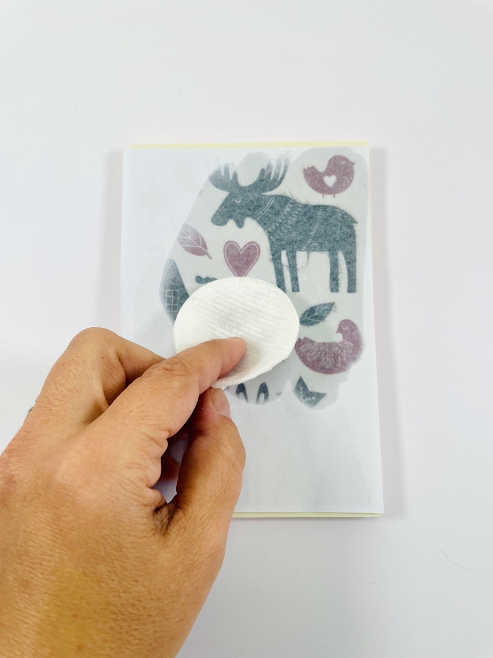 Posez la partie imprimée contre la plaque et frottez délicatement le dos de la feuille de motif avec un coton imbibé de dissolvant.