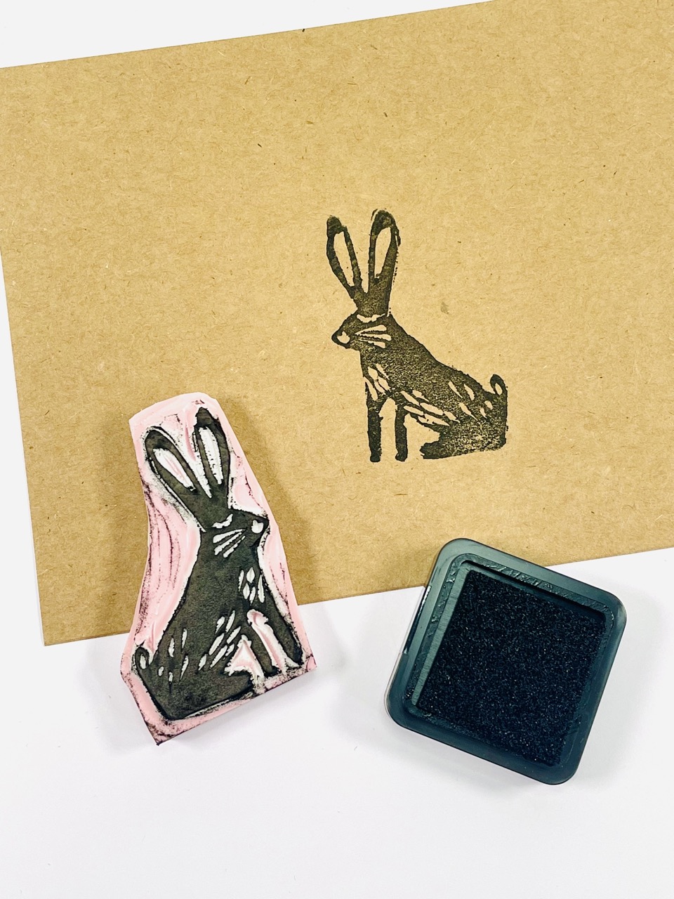 - Kit de linogravure comprenant gomme à graver, poignée en bois, 2 gouges différentes, encreurs, motifs à reproduire, cartes en kraft et enveloppes blanches